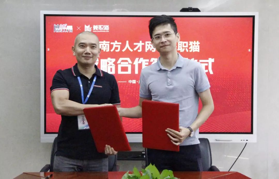 10月23日上午,一站式企业灵活用工平台兼职猫与中国南方人才市场旗下南方人才配置中心在南方人才总部举行战略签约仪式。兼职猫创始人、CEO王锐旭,南方人才配置中心总经理黄剑锋及双方代表出席。双方就从平台资源共享、专场招聘会、校园推广、业务扶持等方面展开深度合作,共同激励华南的人力市场招聘就业,促进劳动力市场良序发展。