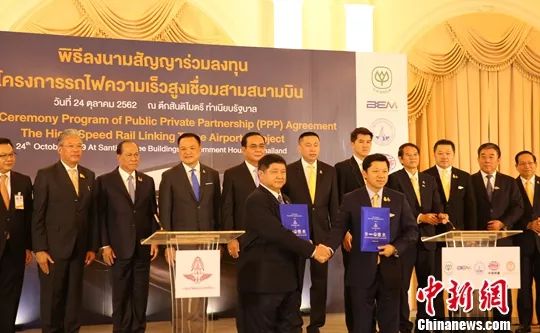 泰国东部经济走廊连接三机场高速铁路项目24日下午在泰国总理府签约。泰国总理巴育、副总理阿努廷以及中国、日本、意大利三国驻泰大使出席签约仪式。项目签约双方分别为泰国国家铁路局和泰国正大控股有限公司牵头组成的联营体“东部连接三机场高铁有限公司”,其中联营体公司成员包括:中国铁建股份有限公司以及泰国企业曼谷高速公路和地铁(大众)有限公司、意大利—泰发展(大众)股份有限公司和初干创(大众)股份有限公司。该项目是泰国首个采用政府与社会资本合作模式(PPP)开发的高铁项目,也是泰国东部经济走廊的重点建设项目,总投资逾2245亿泰铢(约合人民币524亿元),总里程220公里,最高时速250公里/小时,建设期5年,建成后将连接泰国三个重要机场廊曼国际机场、素万那普国际机场和罗勇府乌塔堡机场。
