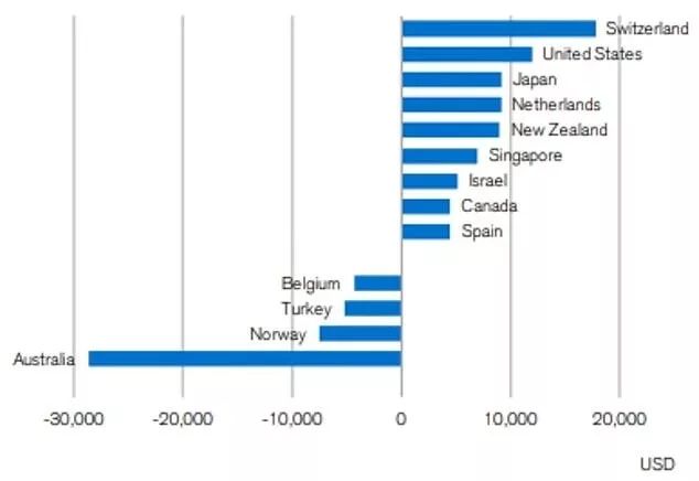 瑞士:人均财富增加了约$25,915澳元 (美元$17,790)美国:人均财富增长了约$17,450澳元 (美元$US11,980)日本:人均财富增长了约$6,302澳元 (美元$US9,180)