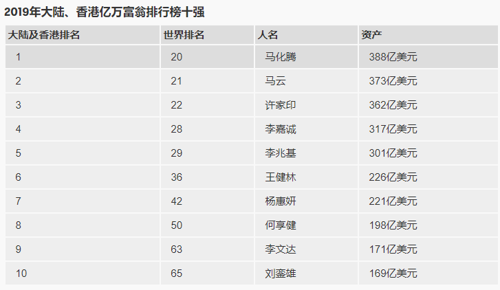根据福布斯数据显示,中国富豪榜前五分别为:马化腾:388亿美元马云:373亿美元许家印:362亿美元李嘉诚:317亿美元李兆基:301亿美元