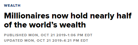 根据最新统计,目前全球有4680万名百万富翁,比2018年增加了110万,美国占据了一半,即新增了67.5万名的百万富翁。
