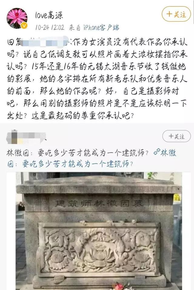 高源还举出了太湖音乐节的例子,因为收了江一燕的钱做她的影展,而把所有新老音乐人的名字放其名字之后。嘲笑江一燕蹭摄影圈习惯了,没想到这次在建筑圈碰壁。