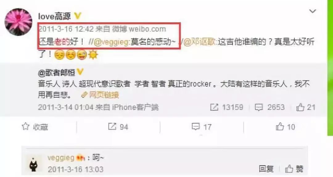 高源自从开通社交平台后就关注了王菲,有时两人甚至还有互动。2011年春天,有人发微博说窦唯的《暮春秋色》受到音乐人的赞誉,接着王菲也转了,还夸赞了一句:“莫名感动。”随后,高源也转发了,并说:“还是老的好!”最重点的是,王菲在这条转发下面留了一个“呵”。