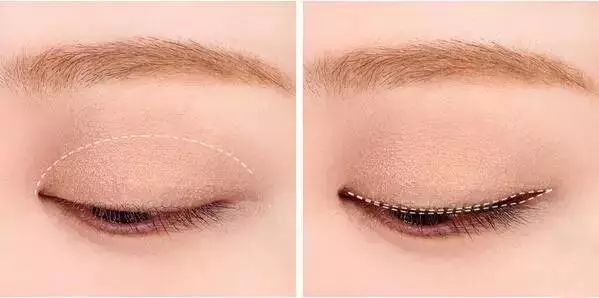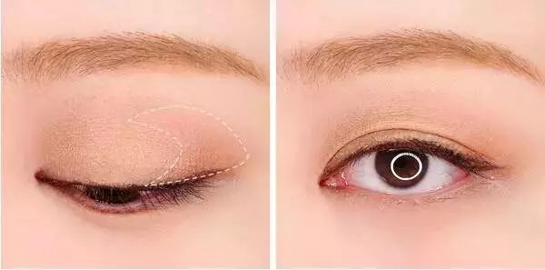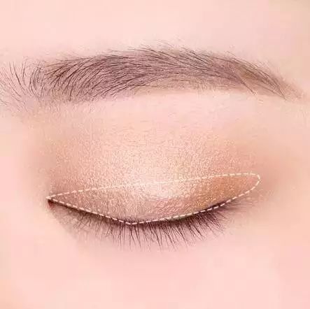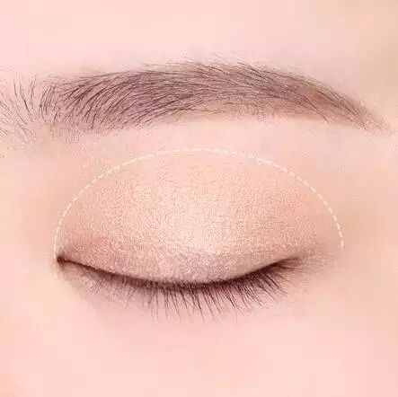 STEP4:香槟色的珠光眼影于图中白色虚线范围内晕染。