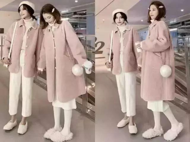 这两个粉色衣小姐姐很亮眼,她们的羊羔绒服款式一长一短,颜色也一模一样,