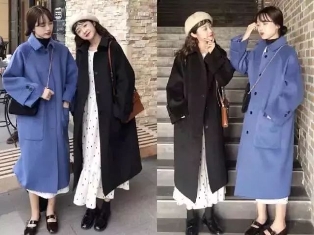 这两个小姐姐都穿蓝色毛大衣,一长一短,各有特色,都是有牛角扣的设计,而且两个小姐姐的高矮都差不多,真是很像两姐妹,