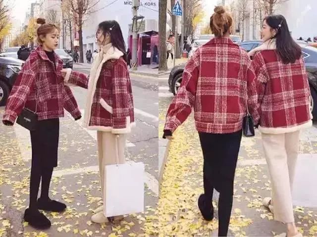 这款复古红格子毛衣外套,很适合学生闺蜜装搭配的一款,短款都很好看,两件同样是翻领设计,另一件里面是米白色羊羔绒设计,不一样的风格,有不一样的美,闺蜜俩这样穿稍微有种慵懒感,下装一黑一白的搭配,各有各的干练气质,对各种身材的小姐姐都非常的友好,简直太美了。