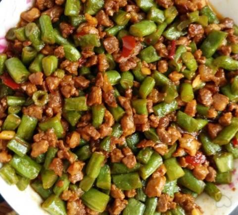 6.豆角熟之后, 加入之前超好的肉沫 ,加适量的盐, 翻炒均匀。