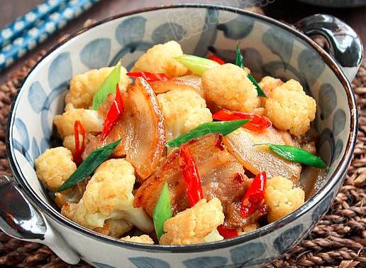6.放入菜花,大火炒至菜花变软,约3,4分钟左右。