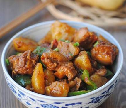 3.倒入没过材料的温水大火煮开后开中小火炖煮;约5分钟后加入土豆块同煮;炖至土豆软糯,汤汁浓稠,加青椒、葱调味,大火收稠汤汁即可