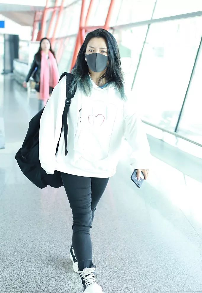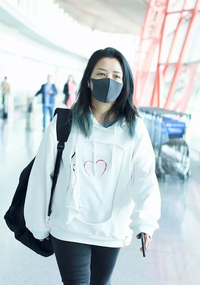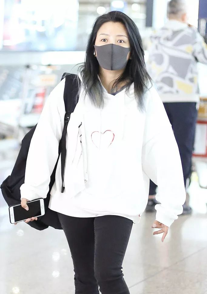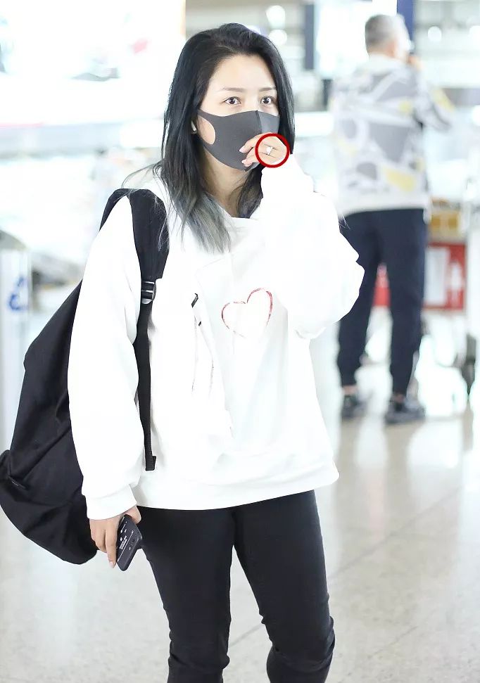 3娃辣妈何洁走机场,爱心卫衣搭紧身裤,大秀钻戒心情好