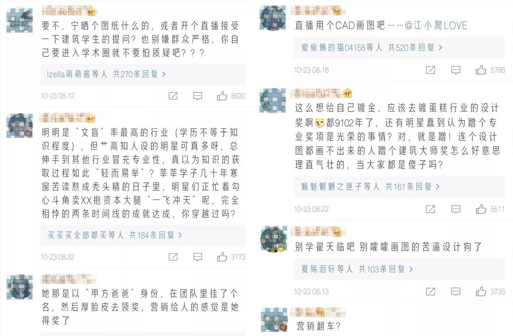 但微博下方却被网友掀翻了车,网友纷纷质疑江一燕拿建筑大奖的真实性。