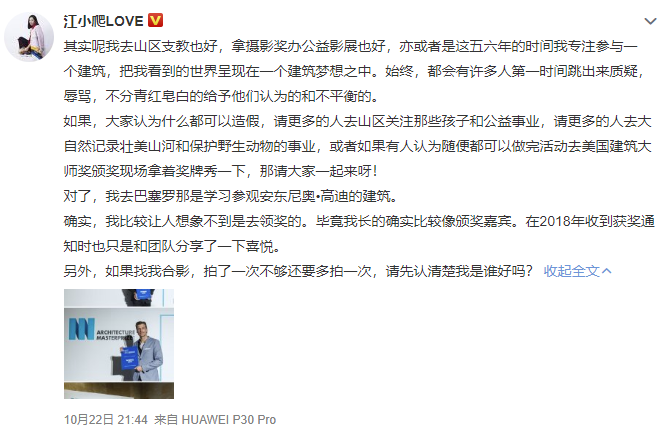 她在微博发表,自己“五六年时间专注参与一个建筑”、“去巴塞罗那学习参观安东尼奥的建筑”、“2018年收到获奖通知”、“被人合影一次不够还有多拍一次”,还有山区支教、摄影奖、公益影展。