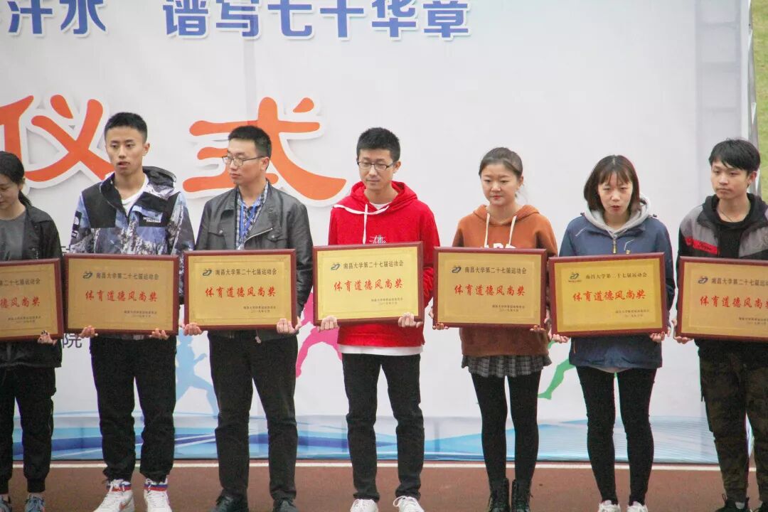 国歌奏响,全体起立,奏唱国歌。随着体育道德风尚奖名单的公布。在此次运动会中,我院师生齐心协力,最终以综合分排名第十三获得本届校运会“体育道德风尚奖”!
