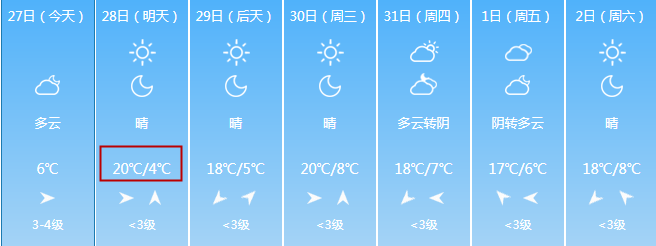 今天晚上到明天白天:多云转晴,气温:6~20℃;