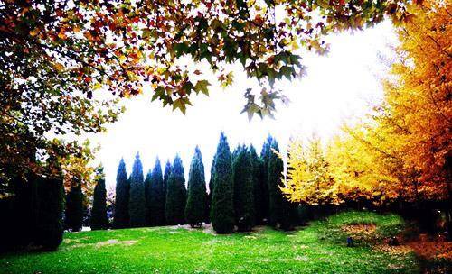 银杏树的叶子开始泛黄比起那些枝繁叶茂的深绿则更显得有韵味大明宫国家遗址公园的秋天也因此而变得娴雅恬静草坪还是一样的翠水还是一样的绿一切是那样的安然平和