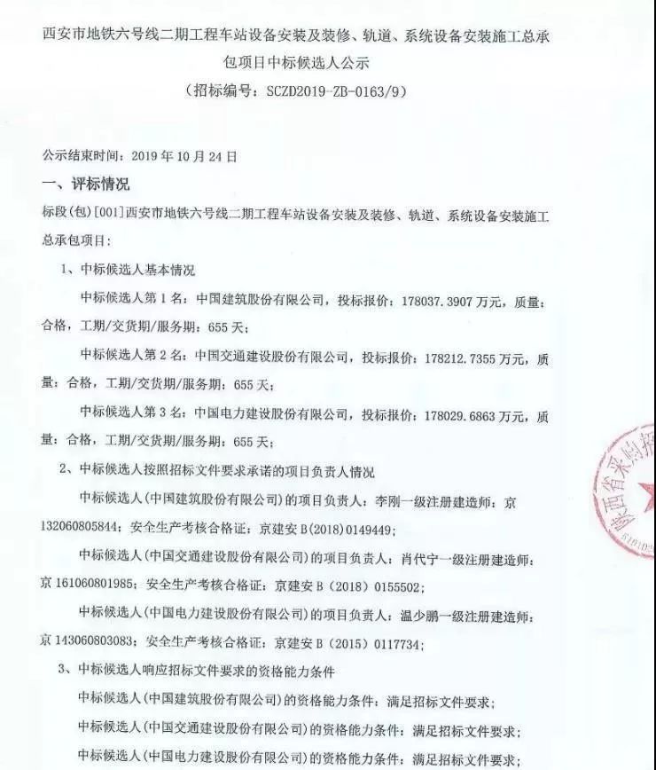 西安市地铁六号线二期工程车站设备安装及装修、轨道、系统设备安装施工总承包项目中标候选人公示