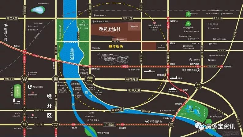绿城西安全运村项目占地面积约1021亩,地上总建筑面积约156万方,平均容积率仅为2.2,是一处跃升生命质量的低密生态品质住区。项目整体按照“全民运动绿色小镇”的概念来打造,周边规划有3座全运国家场馆、灞河之畔幸福岸线生态景观带、全运湖等生活休闲配套;杏园立交枢纽, 14号线、 3号线等交通配套;多座星级酒店、2座国际商业 等商业配套;根据现行 上位规划,拟提供自幼儿园至高中的全龄 体系;以及西安交大一附院陆港分院等高品质医疗配套,将为全运村提供高品质美好生活服务。绿城将自己24年的匠心付诸于全品类美丽建筑中,倾情奉献给了西安全运村,产品形态涵盖富有绿城产品基因的多种产品形式,包含高层住宅、小高层住宅、低密度洋房等产品,更将大量空间用于园区公共生活空间的营造上,独有的小镇 和运动主题商业配套,以及大面积的运动主题场所空间,致力于打造西安城市 特色的国际、健康、活力之城,营造中国 美的全运村。