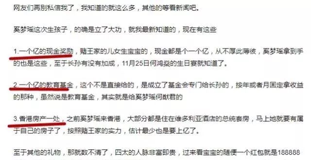 1.一个亿的现金奖励,赌王家的儿女生宝宝的,现金都是个一个亿,从不厚此薄彼,奚梦瑶拿到手的也是这些,至于长孙有没有加成,11月25日何鸿燊的生日宴就知道了。