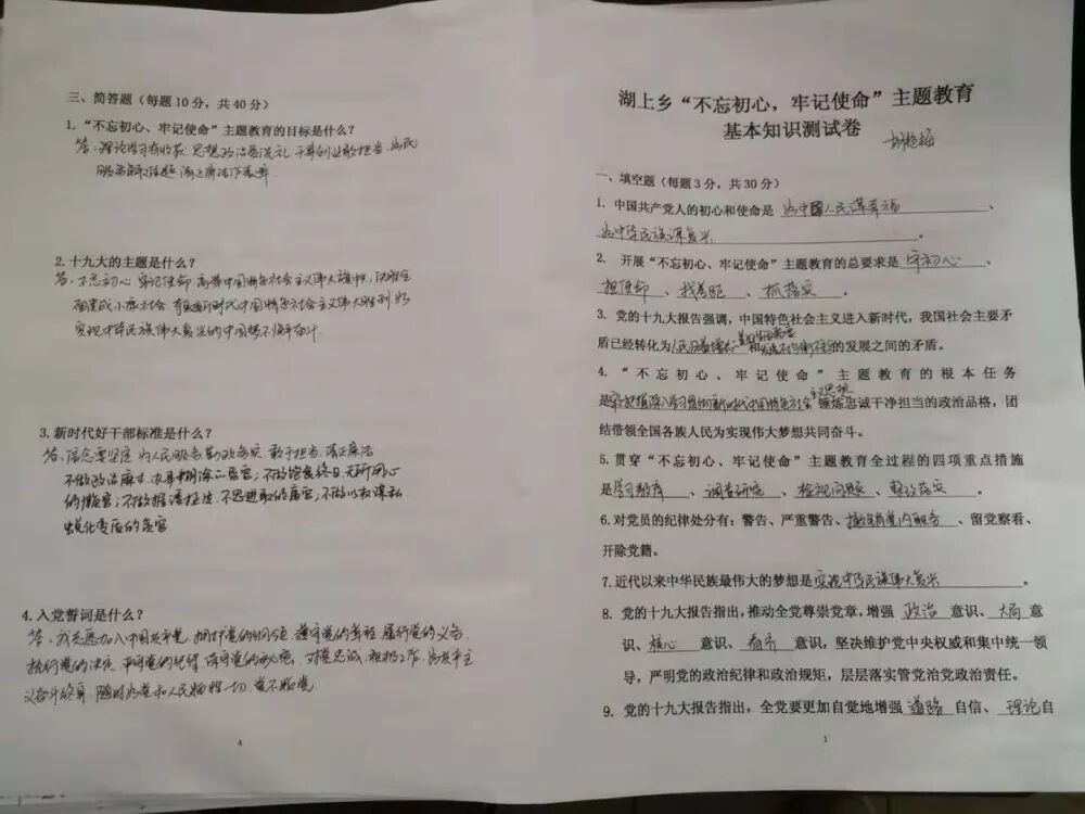 主题党课结束后,我乡党委根据大家平常学习内容出了一份“不忘初心、牢记使命”主题教育基本知识测试卷,让与会人员现场作答,加深学习印象。