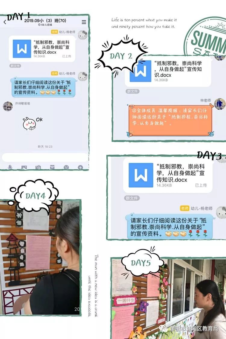 二是利用班级QQ群、班级家园栏。让家长了解“什么是邪教”“邪教如何骗人”“邪教对社会的危害”等相关内容,并请家长向身边的孩子、亲人和朋友宣传,让更多的人加入抵制邪教的行列。