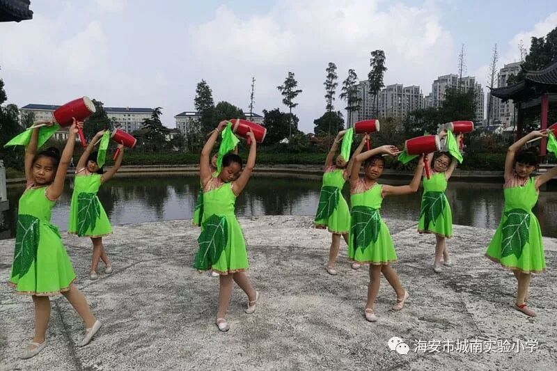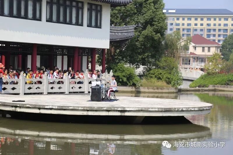 东校区孩子们的海安花鼓在水榭歌台流淌出文明传承的信念;竹笛悠扬和着动人的葫芦丝奏出对祖国的眷恋……