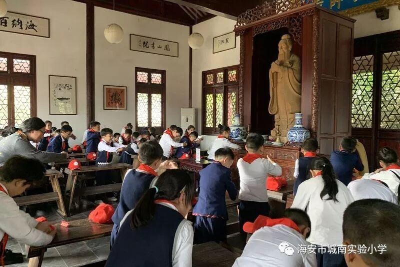 凤山书院,闻书声琅琅进入书院后,大家忍不住停下脚步,瞻仰孔子塑像。据说,这尊塑像是由一棵五百年的香樟树整树雕刻而成!习拜孔礼之后,大家来到“教室”里,齐声诵读。