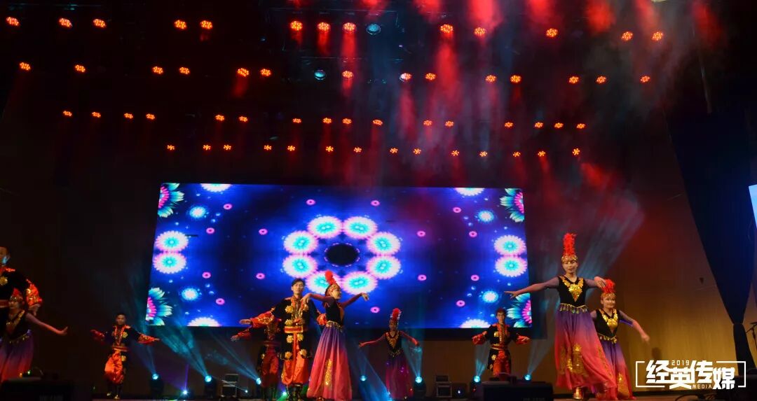 深情环节告一段落,富含异域风情的音乐响起,新疆同学们带着对祖国的热爱、对美好生活的向往走上舞台。蝴蝶般起舞的维吾尔族男女、雄鹰般展翅的蒙古族伙伴们、溪水般柔美的哈萨克姑娘和柔中带刚的小伙儿,他们热情的舞姿引得全场掌声雷动。