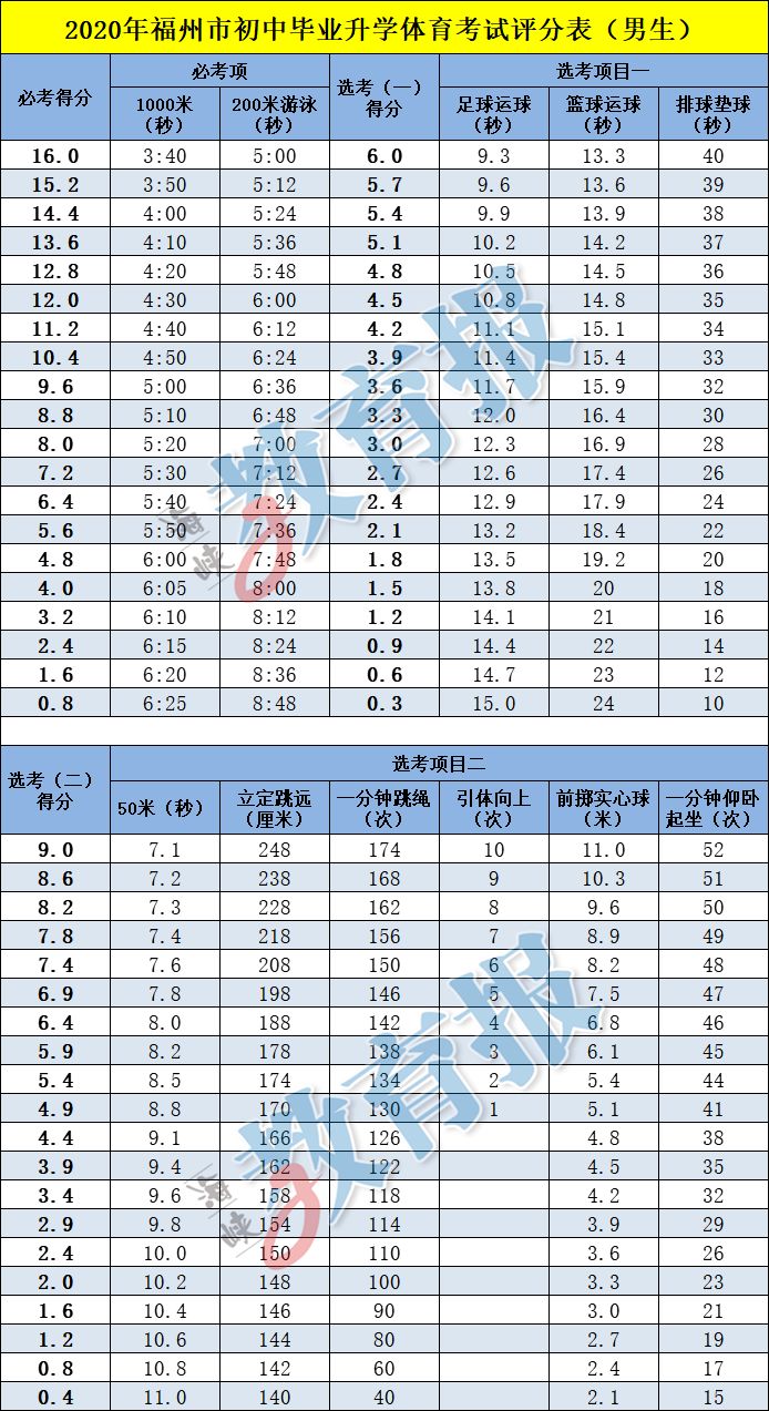 昨晚,福州市教育局根据《关于2020年初中毕业升学体育考试的工作安排》以及工作推进时间的安排,公布福州市2020年初中毕业体育考试评分标准。