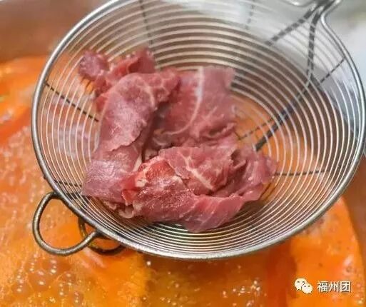将牛肉放进漏勺中,沥干血水,反复三次,肉就煮好啦!