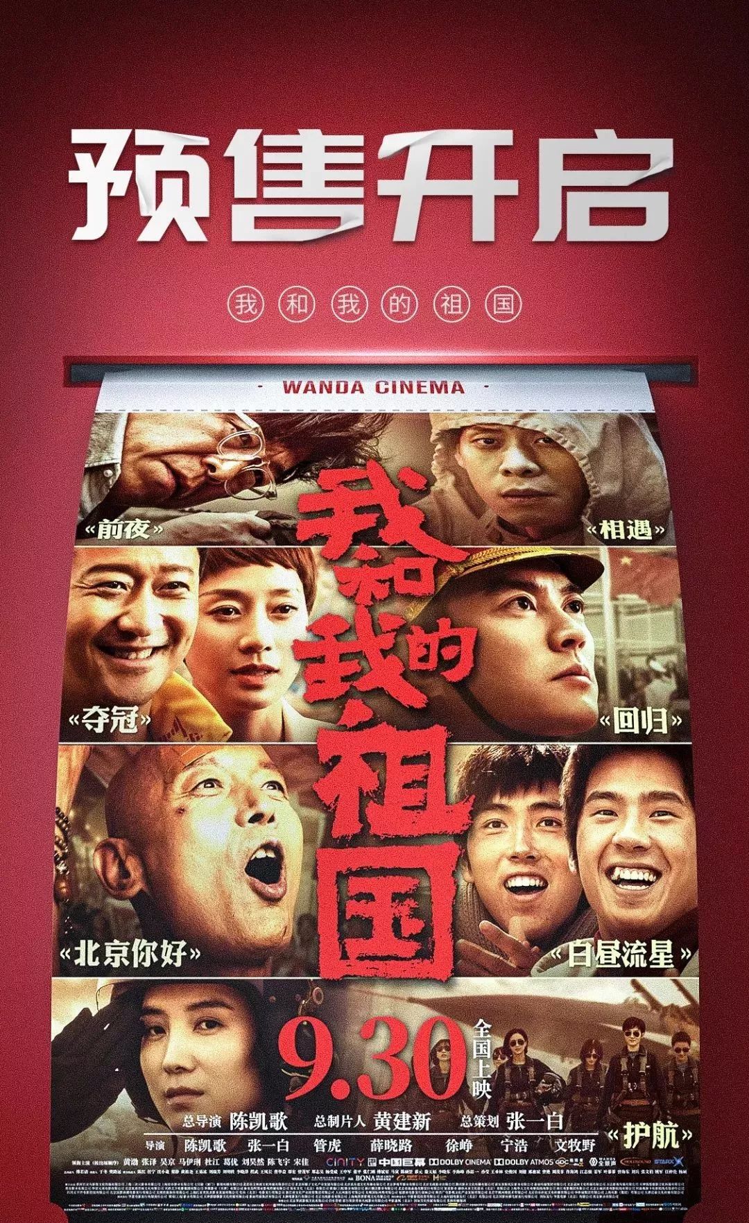 电影《我和我的祖国》宣布提档至9月30日全国公映,主演黄渤、张译、吴京、马伊琍、杜江、葛优、刘昊然、陈飞宇、宋佳亮相提档海报,展现普通人与祖国同呼吸、共命运的关联。作为2019年国家电影局推出的头部电影项目之一,《我和我的祖国》集结陈凯歌、张一白、管虎、薛晓路、徐峥、宁浩、文牧野7位导演,并由一众实力演员强势加盟,组成“中国电影梦之队”。