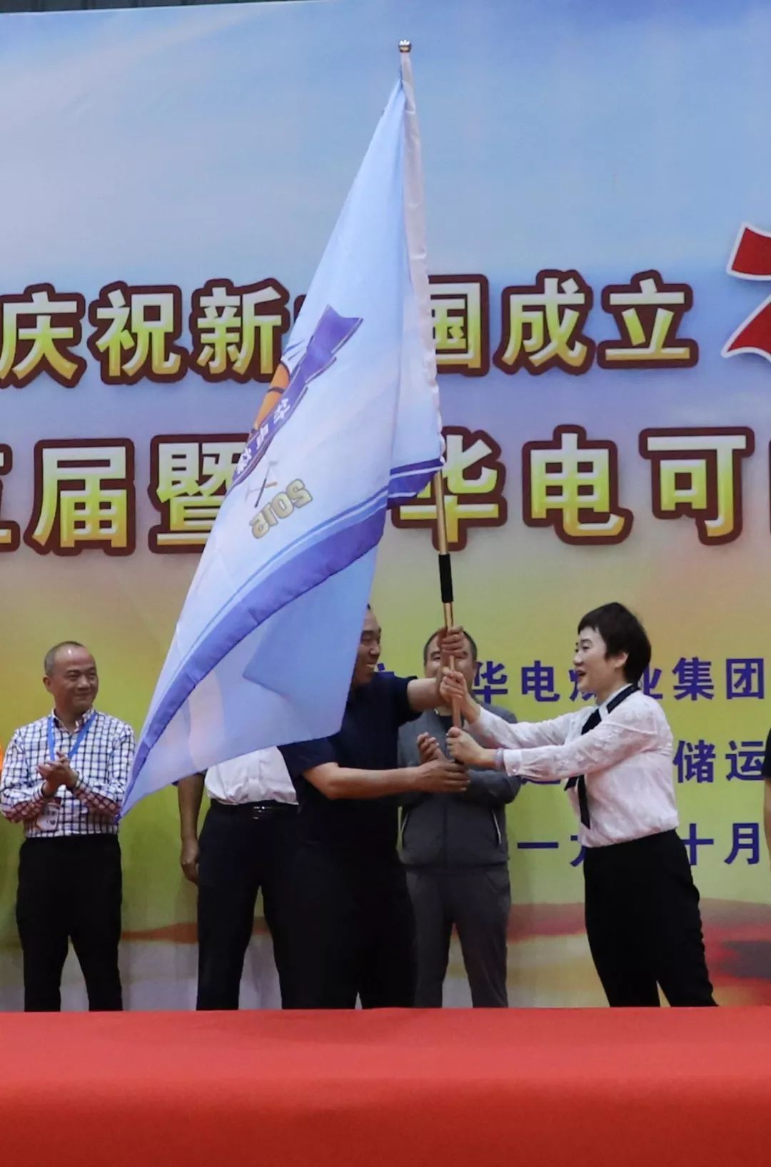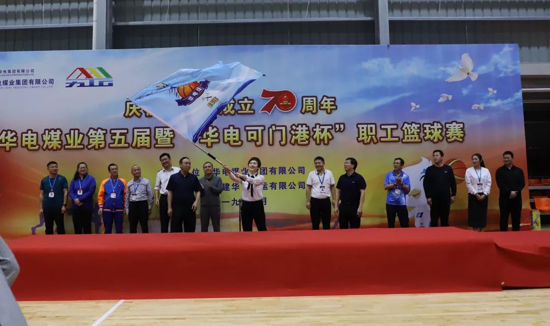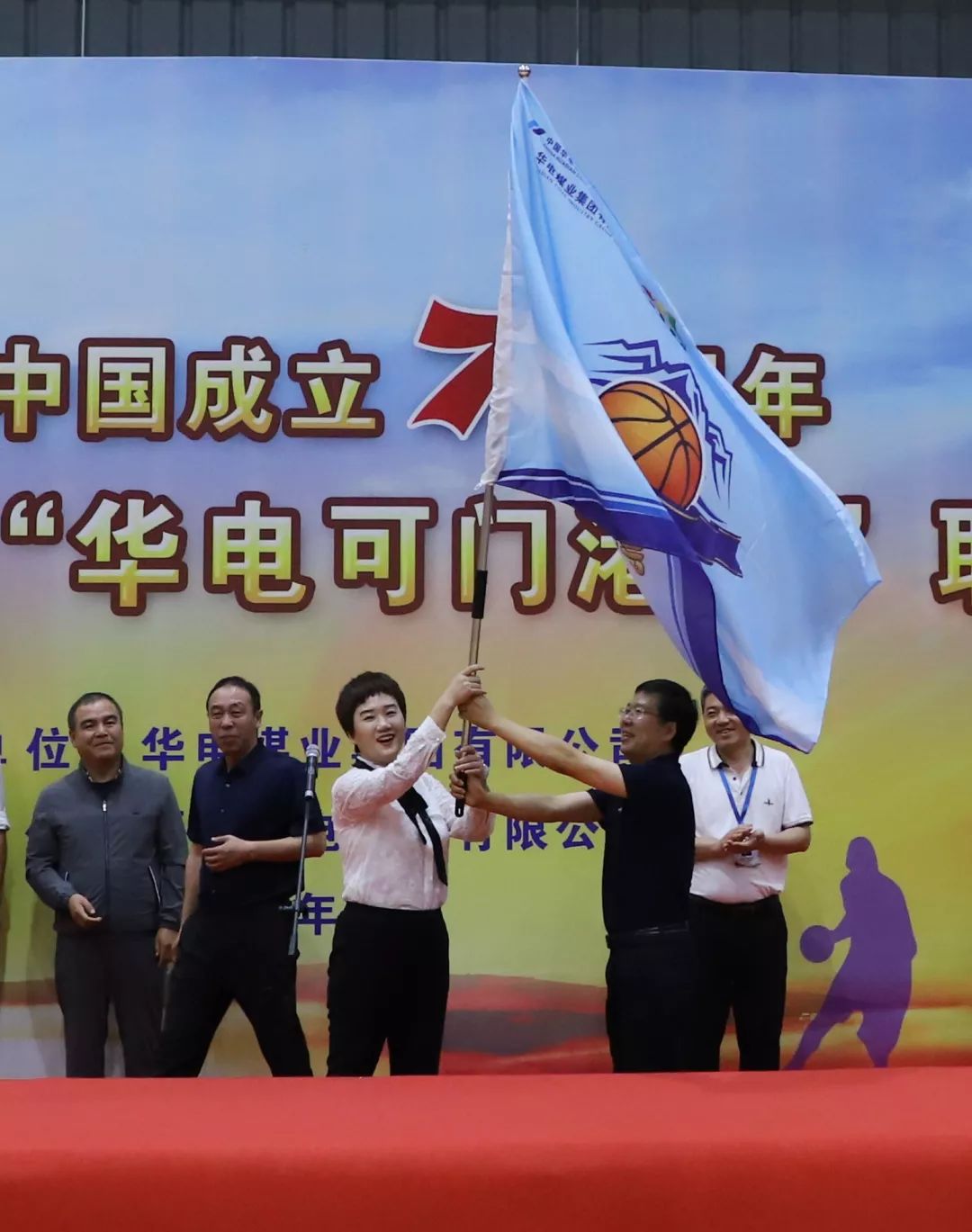 由福建储运党委书记、董事长、总经理王建峰为承办华电煤业第六届职工篮球赛的锦兴公司工会副主席、副矿长熊鹰飞交旗。
