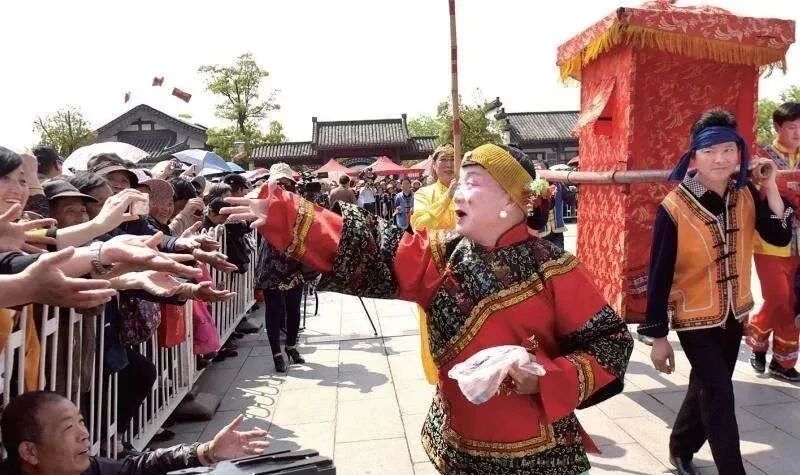 送亲队伍到了男家,鸣铳放鞭炮迎接。轿停正门外,媒人取出“五谷豆”,向花轿顶上抛撒,叫“撒轿米”。撒毕,新娘赏给轿夫红包,由两名“接姑”牵扶新娘出轿,从铺好的五只红布袋上走过,走过的红布袋又依次铺上,一直走到中堂,叫“传宗接代”。进中堂后,先朝天三跪拜,然后向祖宗香案、公婆三跪拜,再踏上红布袋走进洞房。一路上撒生花生,意为“早生贵子”、“子孙满堂”。