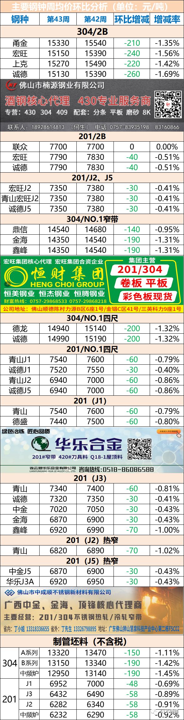 304最高跌260,第43周佛山市场不锈钢均价一遍绿油油!