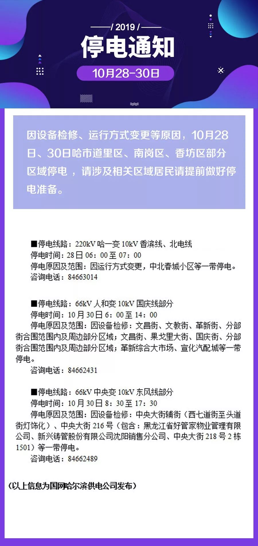 28日-30日,哈尔滨道里、南岗、香坊部分区域停电