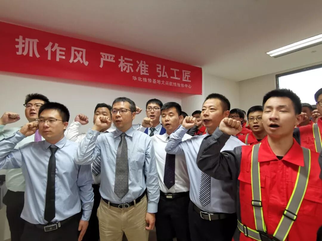 誓师大会海航技术大兴中心誓师动员大会是为了迎接10月27日大兴机场新航班换季,正式开启海航技术大兴机场客户航线维修保障工作而开展的活动。誓师动员大会上,海航技术大兴中心全体员工用响亮的声音表达自己的信心和决心:“忠诚海航事业,落实局方规章;执行公司标准,严守红线底线;树立四个意识,践行五个到位;夯实三基建设,争做行业标杆;立足大兴,服务全球。”