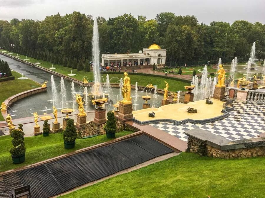 夏宫(彼得大帝的行宫),这座熠熠生辉,金碧辉煌,富丽堂皇的皇家宫殿,被誉为俄罗斯的凡尔赛宫。“最美不过彼得宫”是俄罗斯人对它的至高评价。我们虽然没有进宫殿里面参观,但它的外观足以让人大饱眼福了。我们冒着小雨在上花园转了转,这是一座法式庭园。在宫殿正前方建造了一个镀金塑像组成的大瀑布喷泉群,217座大小雕像和潜浮雕,64个喷泉和2座梯形瀑布景色十分秀丽壮观。杨芳春大姐很热心,给我们拍了张合影,以后几天里,我们五兄弟姐妹的合影大都是她拍的。