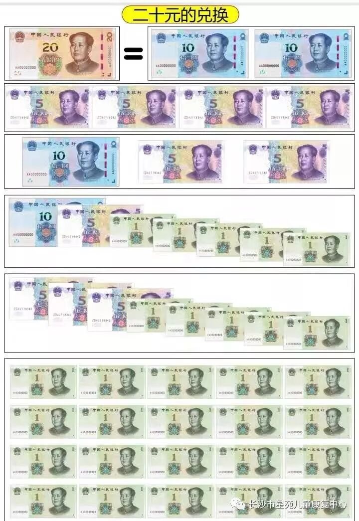 用钱,是特需儿童最重要也最难的课题之一。教孩子认识钱币以后,还需要教他们换算/兑换,并且带孩子生活中反复练习,最终他们才有可能学会使用钱币。