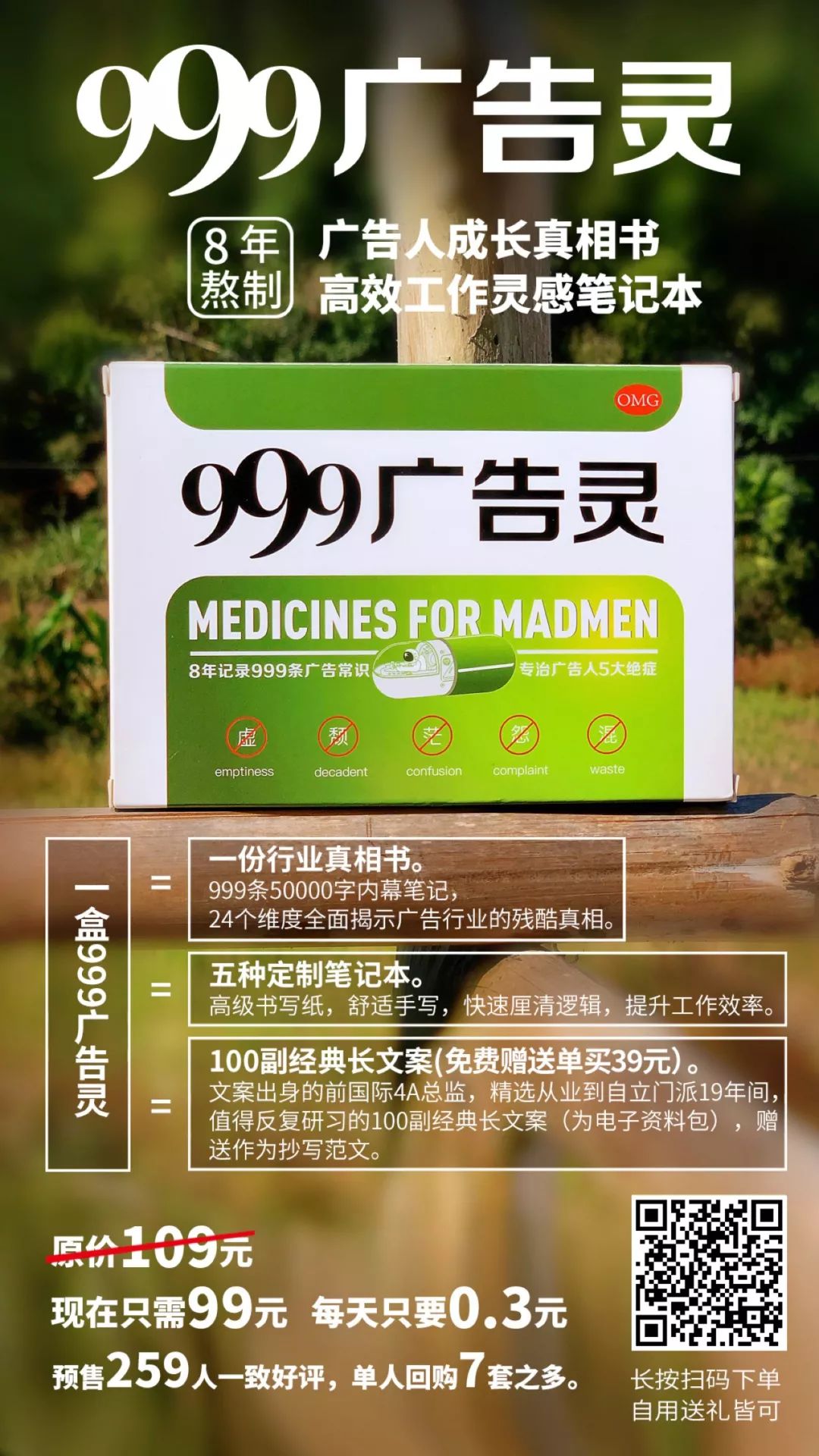一盒999广告灵,又是书又有笔记本,还送价值39元的经典长文案资料包,得不少钱,才能打包带走吧?