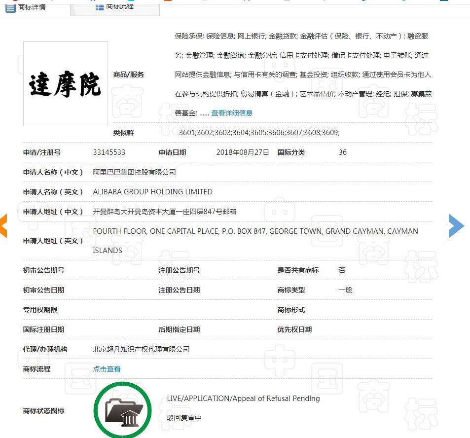 以第33145533号“达摩院”商标为例,阿里于2018年8月27日提交商标申请,用于金融保险等领域,今年年初被商标局驳回,随后阿里提交了驳回复审,仍被拒绝。