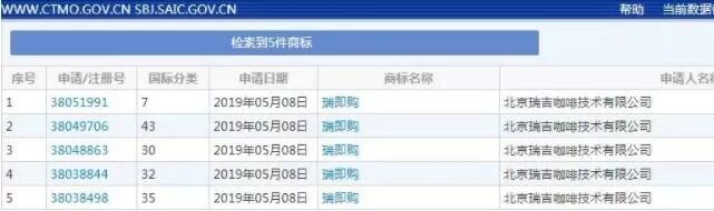 据悉,最近瑞幸咖啡内部正在筹划自助咖啡机项目,名为“瑞即购”。5月,瑞幸一共申请注册了5枚“瑞即购”的商标,分别是7类、30类、32类、35类、43类。