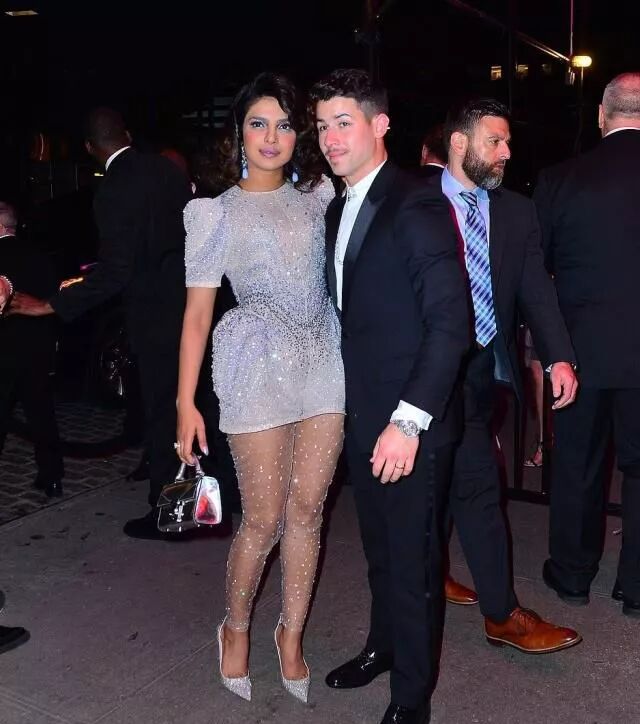 其实我更喜欢看她和乔纳斯一起亮相的时候,之前参加Metgala红毯后的派对上,乔普拉也是选择了这样浅蓝色的迷你裙,星光点点的透视裤子更是展现出了特色,乔纳斯在妻子身边完全就变成了陪衬。