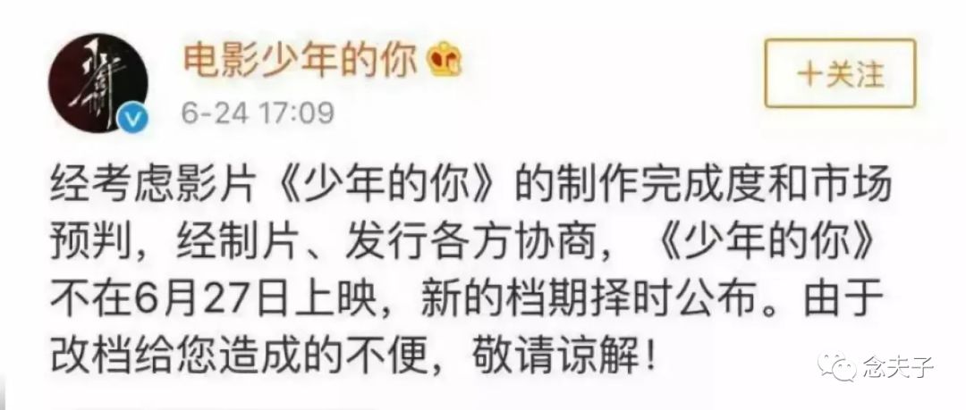 《少年的你》由《七月與安生》的原制作班底拍攝,原計劃在6月27日上映,后果在開映前3天,宣布撤檔,隨后《八佰》也撤檔,官方的解釋都是市場不行需要改檔。前幾天傳出《八佰》11月上映的小道消息,但官方曾經辟謠!
