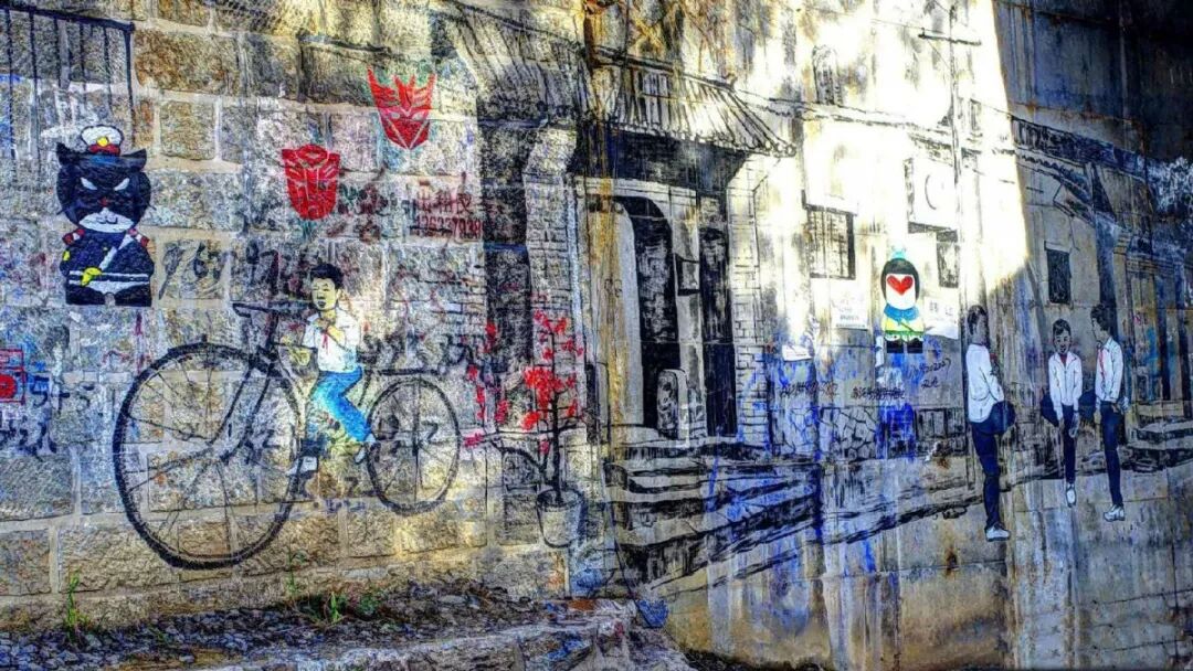 在这里,废弃瓦房的老式建筑、到处充满新潮艺术气息的涂鸦喷绘、老式的火车模型,景色风光依然有点复古与现代的结合风,僻静赏书味,意境,深刻的体会到旧时代与新时代的混搭融合。